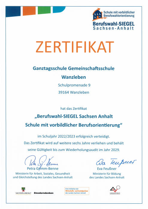 Nach dem erfolgreichen Durchlaufen diese standartisierten Verfahrens ist die GTS Wanzleben 2014 das erste Mal mit dem Berufswahlsiegel zertifiziert wurden. Im Jahr 2017 konnte die Schule das Berufswahlsiegel erfolgreich verteidigen und wurde rezertifiziert.